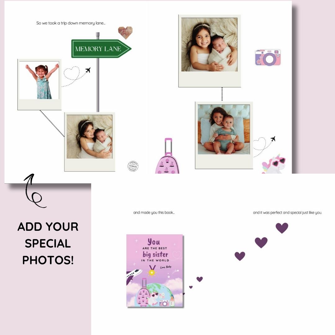 Cute personalized book celebrating a sibling on becoming a new big sister. A special gift from baby to help ease the transition and remind big sis how special she is.