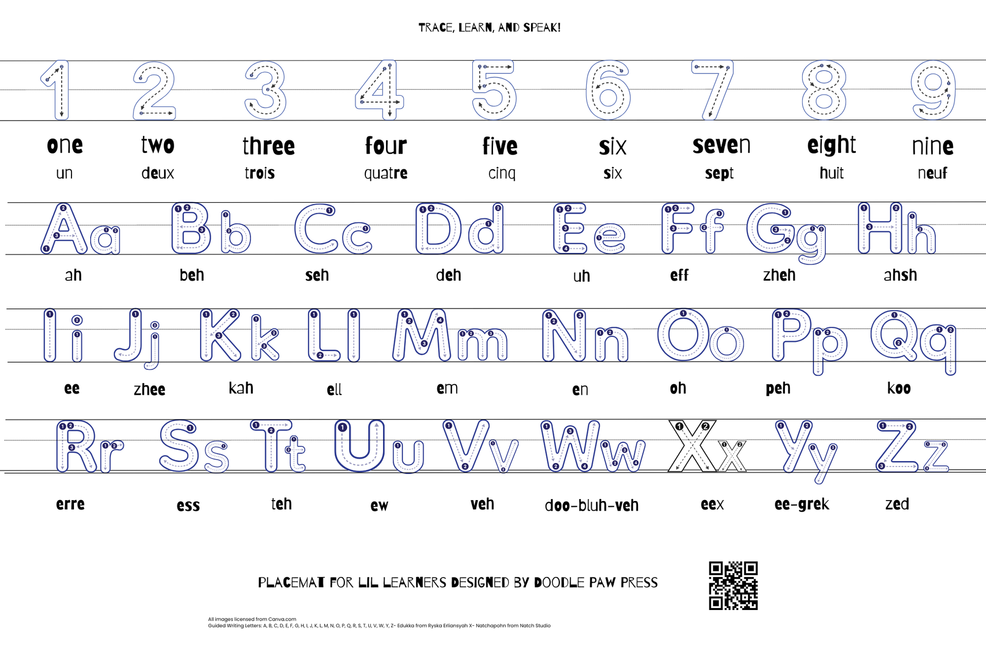 Flip over to the backside to practice your numbers and letters WITH the French pronunciation guides. For best results use washable markers or playdough.